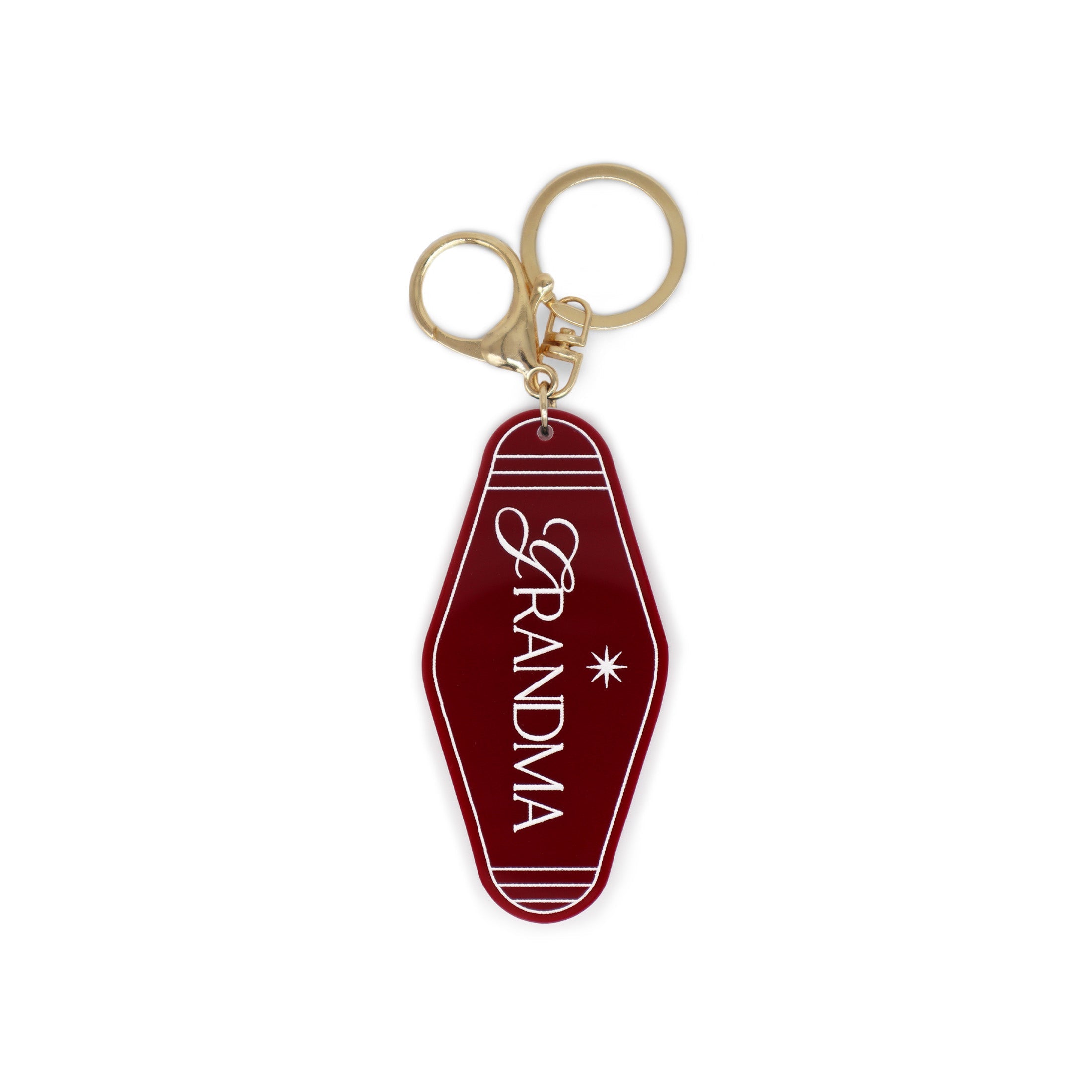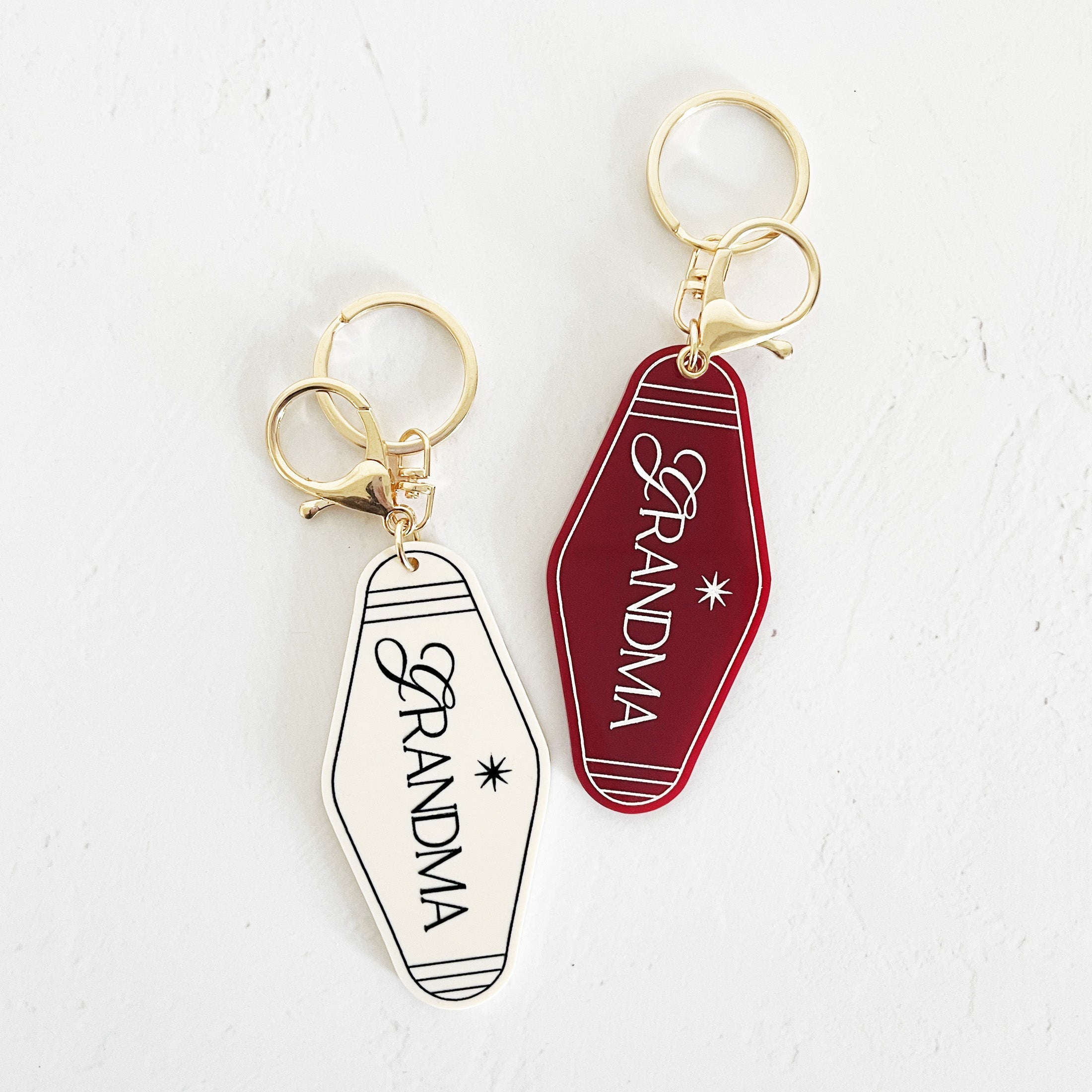 Our Grandma motel keychain is the perfect accessory for anyone who wants to add a touch of retro charm to their keyring or bag! This high-quality keychain features a vintage-inspired motel key fob with the words "Grandma" written in bold, eye-catching letters and embellished with a simple, hand-drawn graphic.